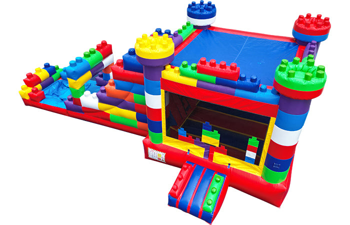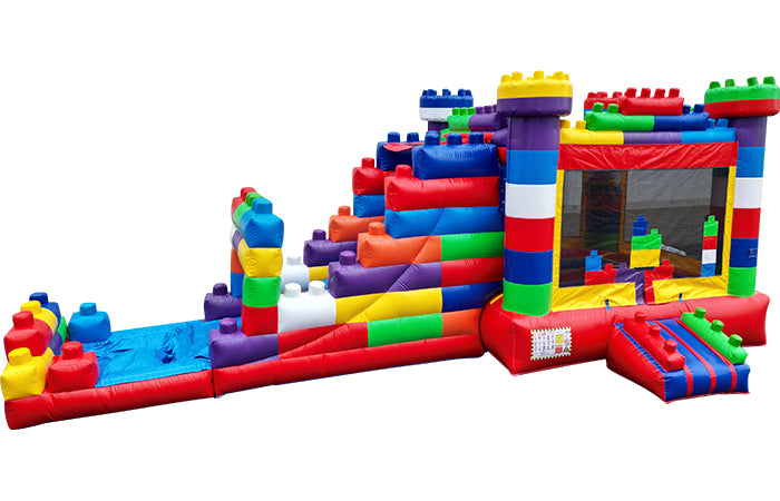 Blocks on blocks! One of our hottest units ever made!! Also one of the most colorful ones. With its vibrant colors and impressive design, the 27ft Block Party Combo is a popular unit for all types of events. Its unique composition of blocks and slides provide hours of endless fun for children and adults alike.