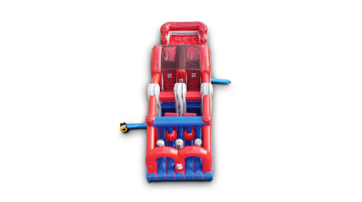 Two riders can play at a time as they race through 7 different elements. Riders start off by going through the entrance (1) red arches, then through the (2) vertical popups, under the (3) hanging wrecking balls, around the (4) T shaped popups, through the (5) horizontal popups, up the (6) dual lane climber and down the (7) dual lane slide. The pool area is an inflated landing zone which can be filled with water to create a splash zone or left empty when using it as a dry inflatable obstacle course.